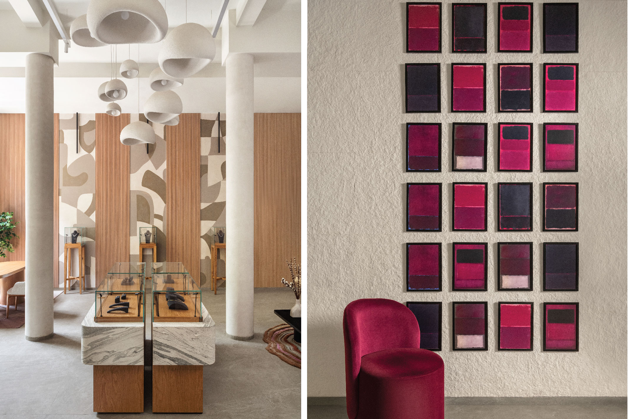 Larger central display units crafted from marble and wood by Arjunvir Gujral Design Studio ground the space with a sense of permanence, she goes on to say. “The choice of natural stone, paired with warm wood, created a balance between solidity and softness, echoing the dual qualities of strength and delicacy found in the jewellery itself.”